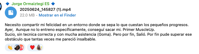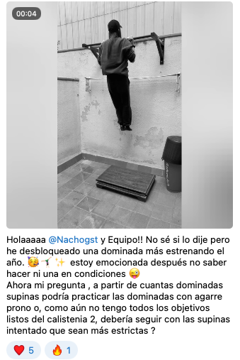 Envía tus vídeos entrenando y en máximo 24 horas (depende de cómo me pilles, te respondo en minutos) te diré si lo estás haciendo bien o si necesitas corregir algo.