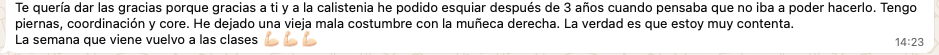 No es la única. Tengo decenas de alumnos que han reducido dolores y superado lesiones gracias a lo que enseño en Academia PRO.